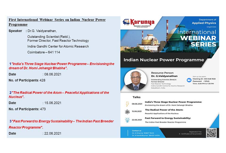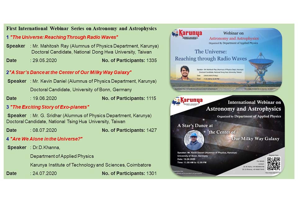 | Awareness of trends in technology-Webinar Series on Astronomy and Astrophysics The Universe: Reaching through the Radio Waves | 29.05.2020 | 1335 | Mr. Mahitosh Ray (Alumnus of Physics Department, Karunya) Doctoral Candidate, National Dong Hwa University, Taiwan |