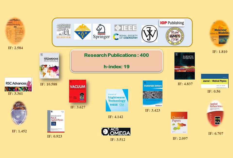 The faculty members regularly publish their research work in well-reputed national and international journals that are indexed in SCOPUS and Web of Science. The research publications are made in the field of materials science, crystallography, non-linear optics, solid state batteries, lithium-ion batteries, bio-compatible devices, thin film devices, solar cells, dye sensitized solar cells, nano fluids, molecular modelling, computational physics and medical radiation physics. Most of the papers are well cited by research groups all over the world. Below is the list of papers published by the department for the last 7 years.